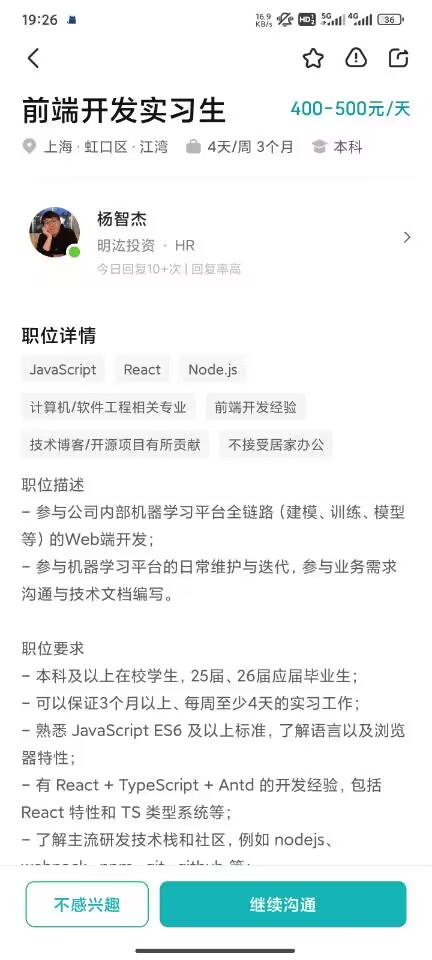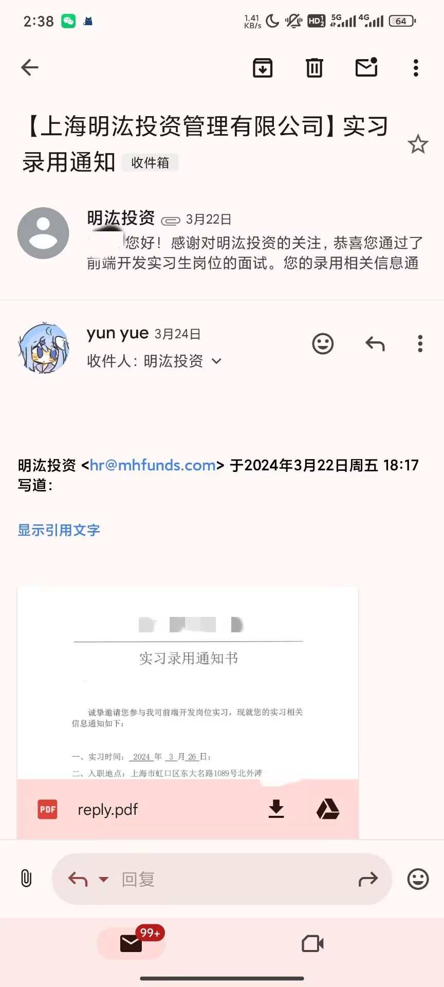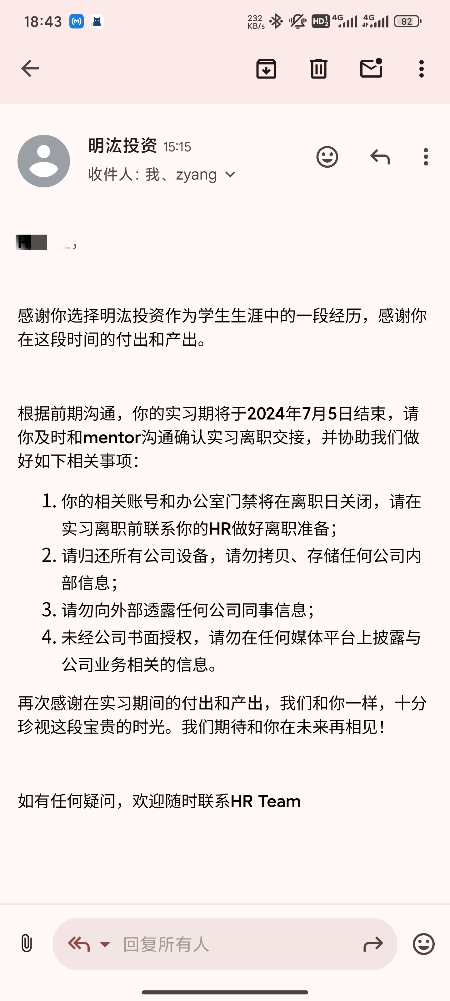 今年是三月份在明汯投资找了一份工作,工作到了七月份,但是很开心,因为是第一个接到的实习 offer, 遇到的 mentor 是很好的人, 教会了我很好,甚至会耐心的教我很多除了技术之外的地方,不管是为人处世还是交流沟通的很多方面,还会鼓励我要去多交流沟通,多锻炼自己的表达能力等的(确实不会说话啊啊啊)还每天都会请我吃饭或者请我喝咖啡(有一次我发工资准备请回来被狠狠拒绝了),很温暖感恩,甚至到我二进宫上海的时候,还给我住的地方!!