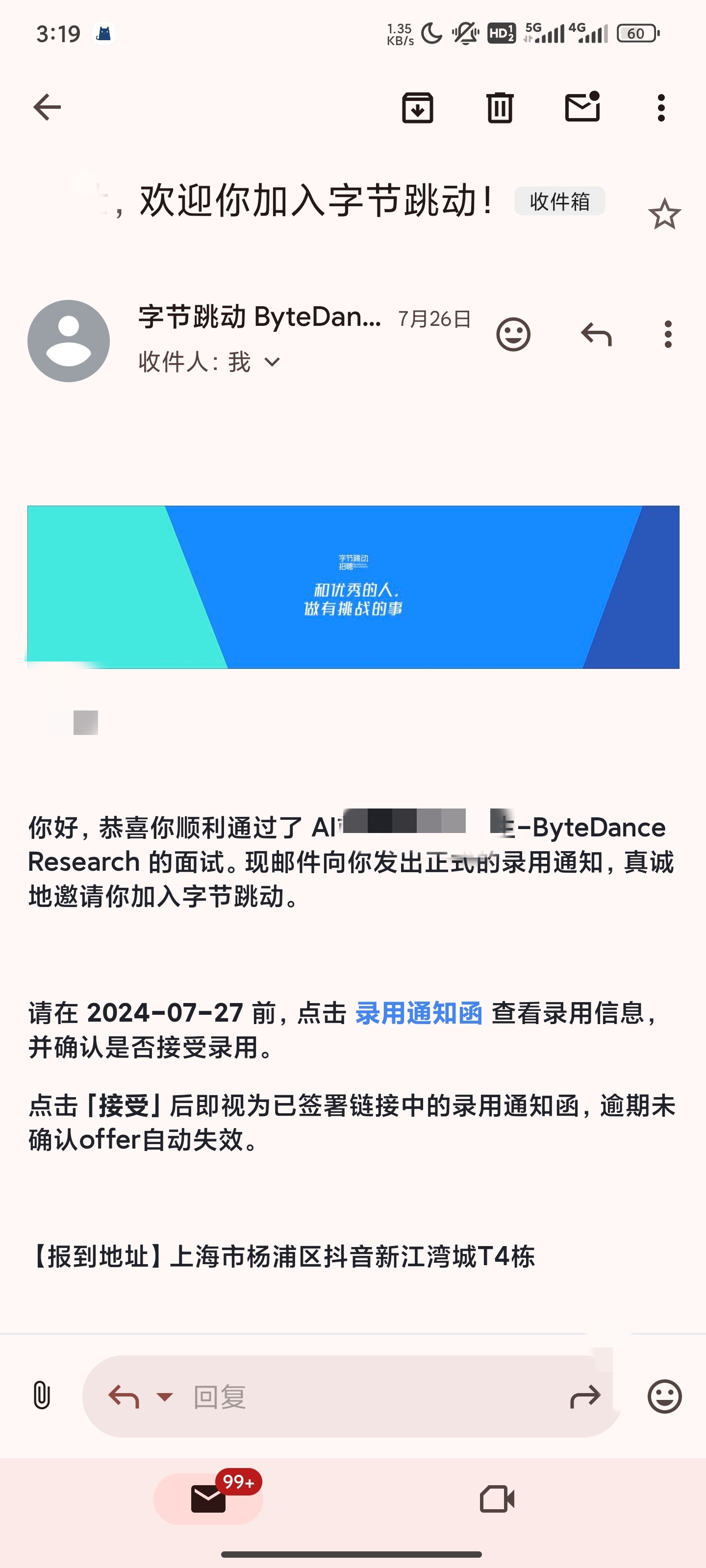 字节的面试流程体验很好,负责招聘的 hr 和面试的 hrbp 都很负责,积极的跟进流程和反馈,在这里很感谢他们