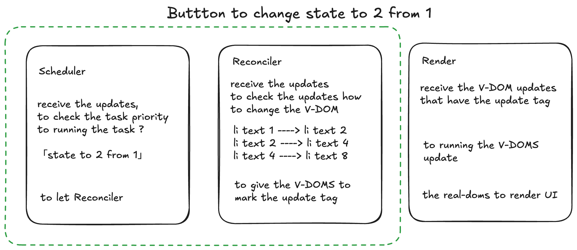 - React 组件状态更新,向 Scheduler 中存入下一个任务,该任务为 React 更新算法,Scheduler提供