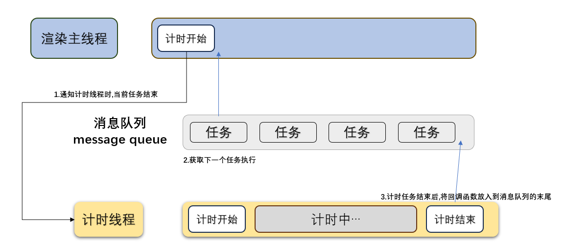 排队: 即 事件循环(event loop) 使用消息队列来处理(message queue)