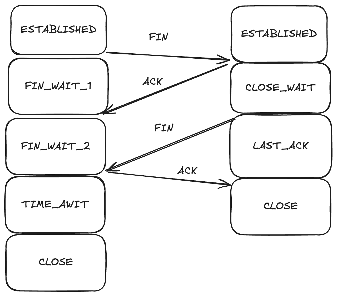 - 客户端打算关闭连接,此时会发送一个 TCP 首部 FIN 标志位被置位 1 的报文,即是 FIN 报文,之后客户端进入 FIN_WAIT_1 的状态