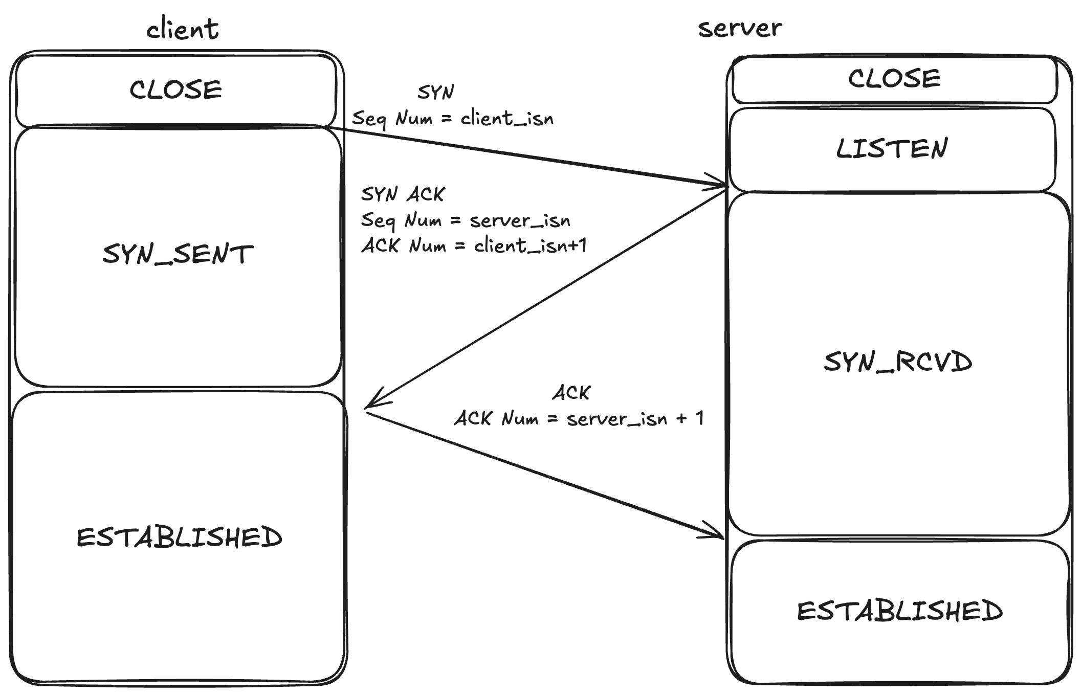 - 客户端会初始化序列号(client_isn),将此序列号置于 TCP 首部的序列号字段中,同时把 SYN 的字段设置成 1,表示 SYN 报文,之后把这个 SYN 报文发送给服务端,表示发起连接请求,该报文并不包含应用层数据,发送后的客户端处于 SYN-SEND 状态